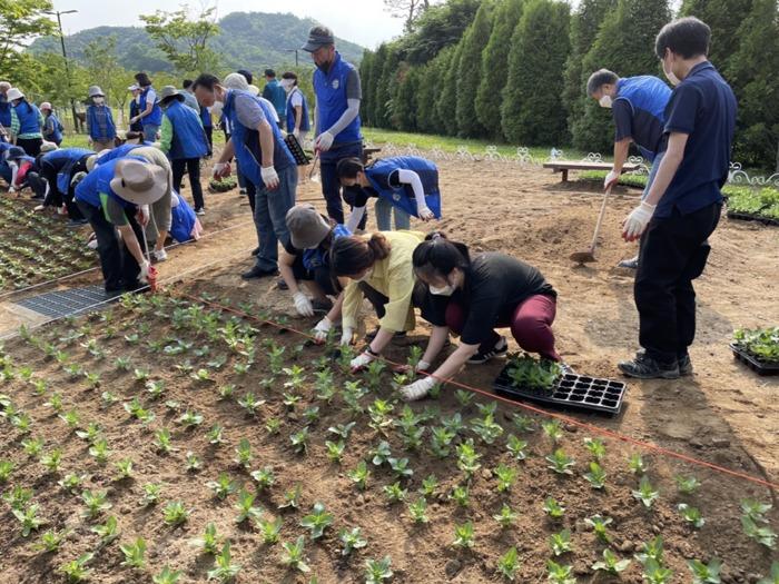 경기 의정부시 송산1동 주민센터는 자생단체 회원 60여명과 함께 최근 이틀에 걸쳐 민락로의 시작점인 용현동 용현지하차도 상부 쉼터에 백일홍 모종 7000본을 심고 꽃밭에 앉아 쉴 수 있는 쉼터를 조성했다. 사진은 봉사자들이 백일홍 모종을 식재하고 있는 모습. (사진제공=의정부시청)