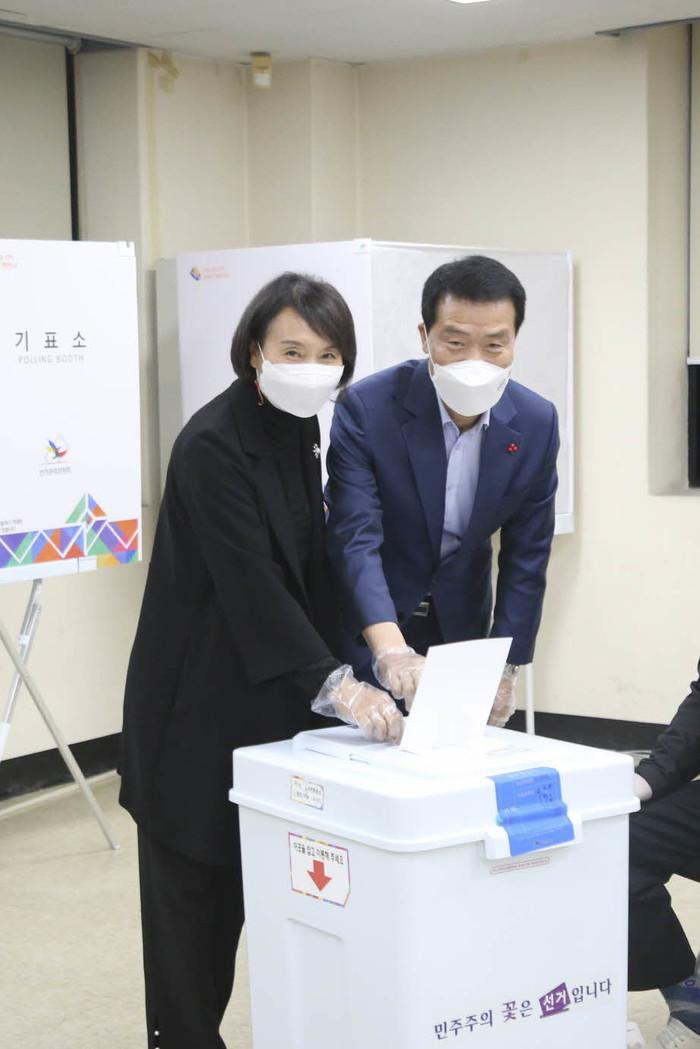 이승로 서울 성북구청장이 지난 3일 아내 임명숙씨와 함께 성북구 석관동 주민센터 2층 회의실을 찾아 서울시장 보궐선거 사전투표를 했다. 사진은 이 구청장(오른쪽)이 투표를 하고 있는 모습. (사진제공=성북구청)