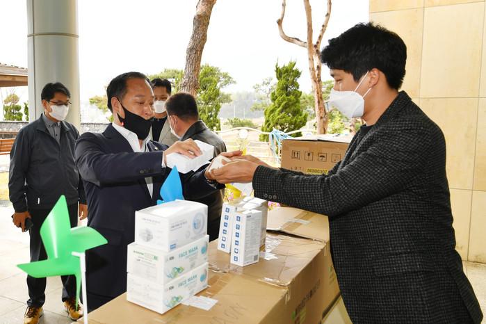 경기 양평군이 기부단체 및 기부자들이 따뜻한 마음으로 기탁한 코로나19 극복 성금으로 마련한 5000만원 상당의 마스크와 체온계를 최근 지역내 170여곳의 사회복지시설에 전달했다. 사진은 정동균 군수가 시설 관계자에게 물품을 전달하는 모습. (사진제공=양평군청)