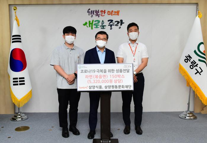 서울 중랑구는 지난 6일 삼양식품서부지점, 삼양원동문화재단으로부터 코로나19 극복을 위한 후원물품(라면 150상자)을 전달받았다. 구는 이 물품을 각동 주민센터와 푸드마켓 등을 통해 저소득 주민에게 전달할 예정이다. 사진은 류경기 구청장(가운데)과 관계자들의 기념촬영 모습. (사진제공=중랑구청)