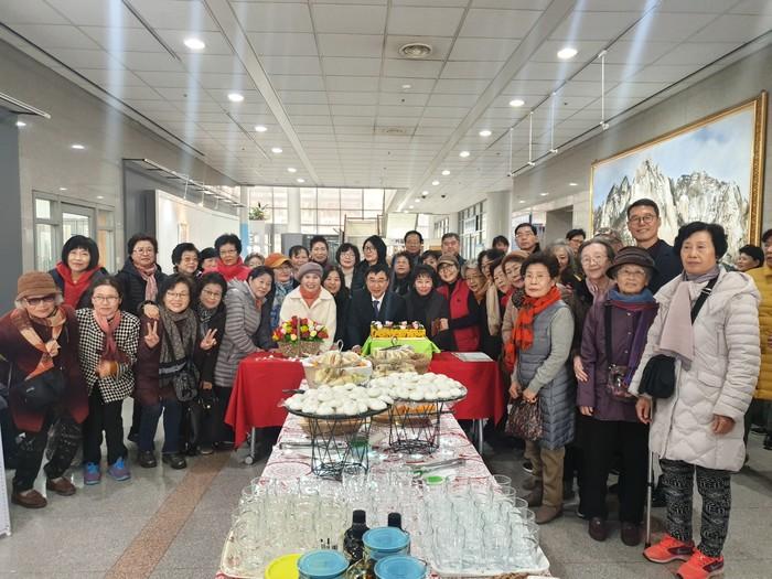 서울 도봉구 도봉2동은 최근 구청 1층 로비갤러리에서 ‘도봉이음 마을학교 졸업전시’를 개최했다. 전시회에는 주민들이 직접 그린 미술작품과 손뜨개방에서 만든 뜨개작품 등이 전시됐다. 사진은 이동진 구청장과 주민들이 기념촬영을 하는 모습. (사진제공=도봉구청)