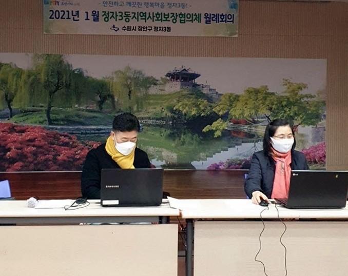 경기 수원시 장안구 정자3동 지역사회보장협의체는 지난 26일, 1월 월례회의를 비대면 영상회의로 개최했다. 이 회의에서는 지난 12월 진행한 사랑의 동지팥죽 나눔 사업 등에 대한 결과보고와 복지사각지대 발굴을 위한 ‘모닝 드라이브 스루’ 캠페인에 대해 논의했다. 사진은 회의가 진행되고 있는 모습. (사진제공=장안구청)