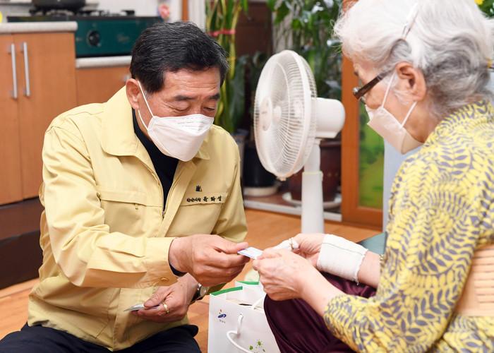 윤화섭 경기 안산시장이 전통시장에 활력을 불어넣고 지역 소상공인을 돕기 위해 전국적으로 추진 중인 ‘착한 선결제’ 운동에 동참했다. 사진은 최근 거동이 불편한 한 시민의 가정을 방문한 윤 시장(왼쪽)이 다온 카드를 건네고 있는 모습. (사진제공=안산시청)