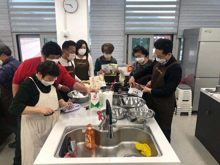 경기 남양주시 수동면 주민자치위원회는 최근 가정의 달을 맞아 직접 만든 쿠키와 머핀·찹쌀 파이를 담은 ‘행복빵빵 꾸러미’를 준비해 6.25 참전용사 가구와 한부모가정 등 50가구에 전달했다. 사진은 이날 봉사자들이 쿠키와 머핀을 만들고 있는 모습. (사진제공=남양주시청)
