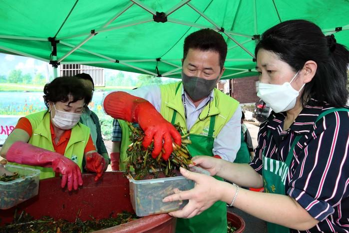 인천 동구 화수1·화평동 주민자치회는 최근 '사랑의 밑반찬' 2차 나눔을 진행했다. 사진은 이날 행사에 참여한 허인환 구청장(가운데)과 주민자치회 회원들이 밑반찬을 준비하고 있는 모습. (사진제공=동구청)