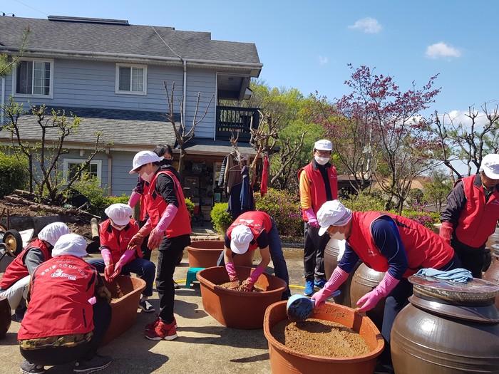 경기 동두천시 생연1동 주민자치위원회에서는 지난 18일 주민자치위원 등 20명이 참석한 가운데, 주민자치위원회 특색사업인 ‘전통 장 만들기’를 위해 장 가르기 행사를 했다. 사진은 행사에 참여한 관계자들이 숙성된 장에서 검게 변한 소금물과 메주 덩어리를 분리하고 있는 모습. (사진제공=동두천시청)