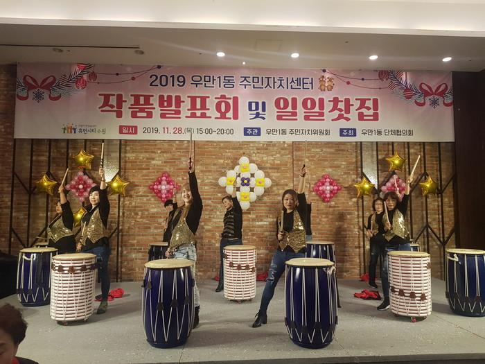 경기 수원시 팔달구 우만1동은 최근 지역주민 500여명이 참여한 가운데 수원노블레스웨딩홀에서 ‘주민과 함께하는 주민자치센터 작품발표회’와 함께 ‘우만 사랑 나눔 일일찻집’을 개최했다. 사진은 행사 참여자들이 난타 공연을 선보이는 모습. (사진제공=팔달구청)