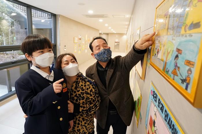 서울 동대문구 답십리1동 래미안미드카운티아파트는 최근 이웃 간 소통하고 화합하는 아파트문화를 만들기 위해 ‘먼저 웃으며 인사하기’를 주제로 어린이 그림 공모전을 개최했다. 사진은 대상을 받은 김진우 어린이(왼쪽)와 어머니가 래미안미드카운티 입주자대표회장과 함께 작품을 관람하고 있는 모습. (사진제공=동대문구청)