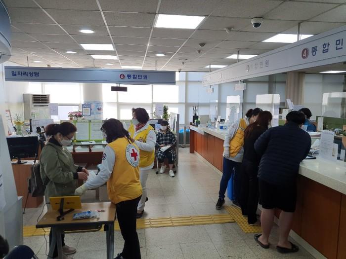 경기 광주시 광남적십자봉사회가 지난 25~26일 광남동행정복지센터에서 경기도 재난기본소득 신청접수를 돕는 봉사활동을 펼쳤다. 이날 회원 6명은 발열체크, 신청서 작성안내 등을 지원했다. 사진은 재난소득 신청접수를 돕고 있는 회원들의 모습. (사진제공=광주시청)
