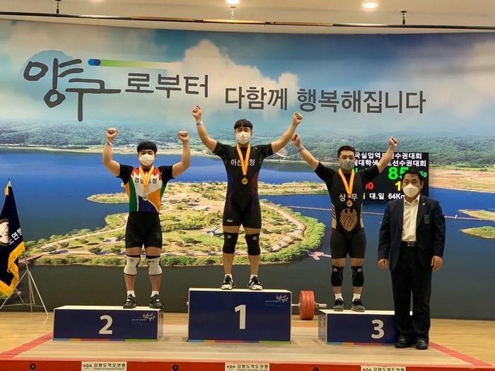 충남 아산시 역도팀이 최근 강원 양구군에서 열린 ‘2020 전국실업역도선수권대회’에서 금메달 2개, 은메달 4개, 동메달 3개를 획득했다. 이번 대회에서는 지난 2월 국가대표로 선출된 양지웅 선수가 인상 1위, 용상 2위로 합계 1위를 차지했다. 사진은 시상식에서 양 선수(가운데)가 포즈를 취하는 모습. (사진제공=아산시청)