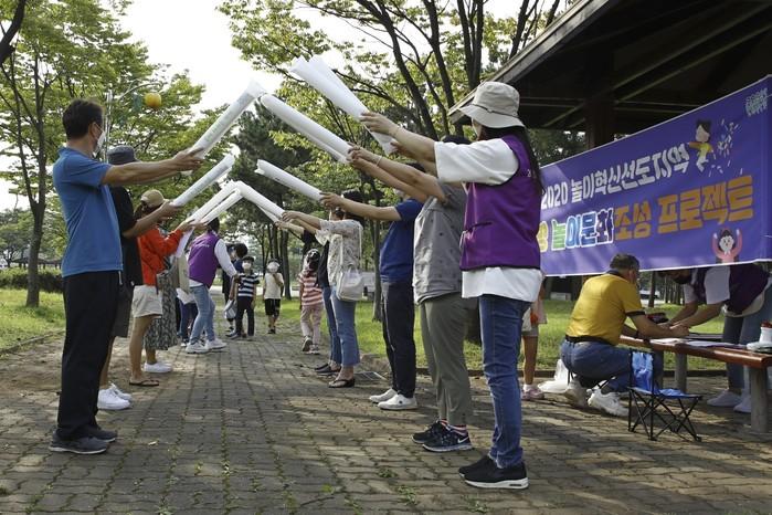 경기 안산시는 보건복지부 주관 ‘2020년 놀이혁신 선도지역’ 공모사업 선정으로 추진 중인 ‘안산형 놀이문화조성 프로젝트’를 최근 호수공원에서 시작했다. 놀이내용은 재난·안전 등을 주제로 선정해 야외의 지형·지물을 이용해 상황에 맞는 놀이를 아이들과 함께 기획하고 진행한다. 사진은 놀이활동가들과 어린이들이 함께 놀이를 하고 있는 모습. (사진제공=안산시청)