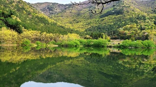 | ▲ 해남읍 해리 소재 금강저수지에 비친 금강산 전경 / 사진=해남군 제공 |