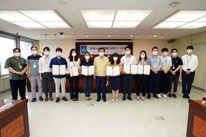 서울 동대문구가 최근 기획상황실에서 한국판 뉴딜 정책제안 발표회 및 시상식을 개최했다. 구는 한국판 뉴딜과 관련 전직원을 대상으로 정책제안을 공모했다. 사진은 유덕열 구청장(왼쪽에서 일곱 번째)과 수상 부서·주무관들이 기념촬영을 하는 모습. (사진제공=동대문구청)