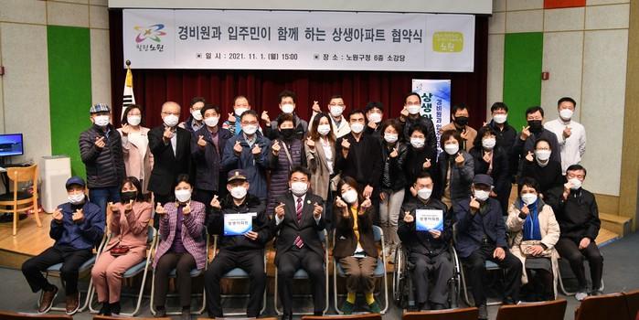 서울 노원구는 1일 ‘경비원과 입주민이 함께하는 상생아파트 협약식’을 열었다. 협약식은 경비원과 입주민간의 공감대를 형성, 상생과 협력의 노사문화를 조성하기 위한 자리로 올해 28개 단지가 신규로 협약을 맺었다. 사진은 협약식에서 오승록 구청장(앞줄 가운데)이 기념촬영을 하는 모습. (사진제공=노원구청)