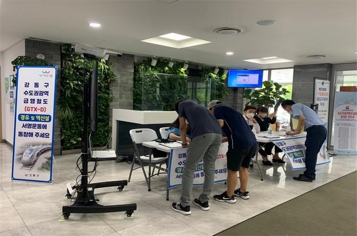 구는 GTX-D의 유치를 위해 지난 3월부터 구 소식지, 홈페이지, SNS 등으로 QR코드를 이용한 쉽고 빠른 온라인 서명운동, 구청 청사와 전 동주민센터, 지하철역 등 주요 거점에서는 오프라인 서명운동을 지속 추진해왔으며, 지난 8월5일 주민설명회를 개최해 주민공감대를 공고히 하고, 24일에는 ‘강동구·하남시 GTX-D 신설 토론회 및 유치위원회 발대식’을 개최한 바 있다.