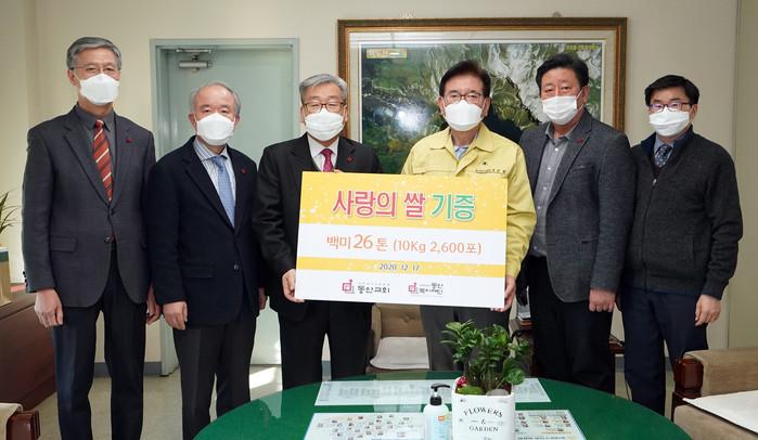 서울 동대문구는 최근 지역내 위치한 대한예수교장로회 동안교회로부터 취약계층을 위한 성탄절 기념 '사랑의 쌀' 2600포(포당 10kg·환가액 7540만 원)를 전달받았다. 사진은 전달식에서 유덕열 구청(오른쪽에서 세 번째)과 관계자들이 기념촬영을 하는 모습. (사진제공=동대문구청)