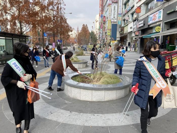 경기 수원시 장안구 정자3동은 최근 통장협의회와 함께 정자중심상가 일대에서 ‘쾌적한 특화거리 조성’을 위한 청결활동을 펼쳐 올바른 쓰레기 배출 요령을 홍보하고 무단투기자 단속도 했다. 사진은 이날 참여자들이 쓰레기를 줍고 있는 모습. (사진제공=장안구청)