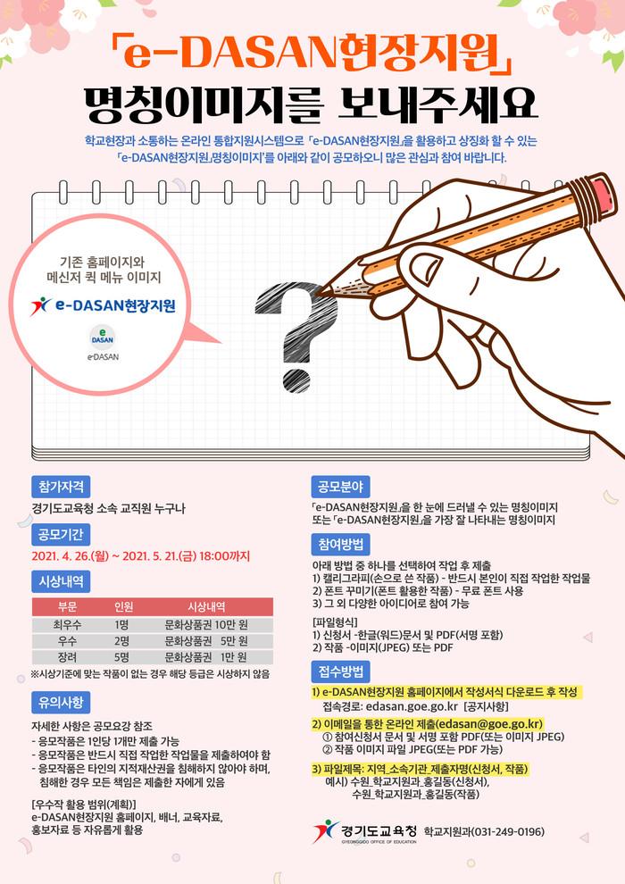 [수원=임종인 기자] 경기도교육청은 오는 5월21일까지 도내 교직원에게 교무학사·행정·일반 업무관련 통합검색 등을 제공하는 온라인 업무지원시스템 ‘e-DASAN현장지원’의 새로운 상징(CI)을 공모한다고 27일 밝혔다.