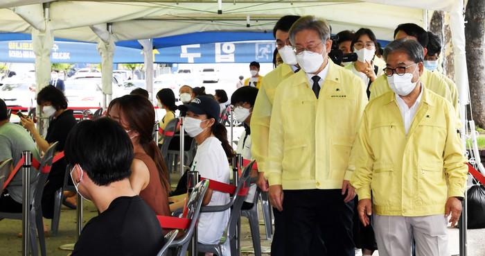 | ▲ 19일 경기 수원시 장안구 코로나19 백신 예방접종센터를 방문한 이재정 경기도교육감(오른쪽)과 이재명 경기도지사가 접종 참여 학생들을 살펴보고 있는 모습. (사진제공=경기도교육청) |
