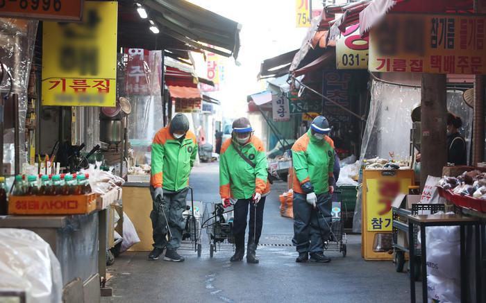 8일 오전 경기 성남시 모란전통기름시장에서 성남시자율방재단원들이 모란민속5일장 장날을 하루 앞두고 코로나19 예방을 위해 방역을 하고 있다.