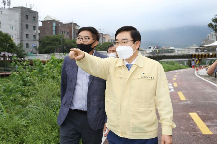 이동진 서울 도봉구청장은 최근 계속되는 집중호우로 수위가 상승한 지역내 하천의 주민 출입통제 상황과 각종 부유물들의 청소 정비 현황을 점검했다. 사진은 이 구청장(오른쪽)이 담당 직원들과 함께 우이천을 찾아 하천 부유물 청소 작업을 지시하고, 주민들의 출입통제 상황 점검하고 있는 모습. (사진제공=도봉구청)