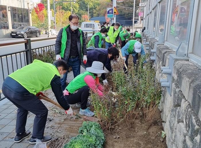경기 남양주시 다산1동 통장협의회·바르게살기협의회·새마을부녀회는 최근 상습 쓰레기 무단 투기 구간인 미금중학교 주변 약 90m 구간을 3개 구역으로 나눠 자산홍·화살나무·꽃양배추의 꽃묘를 식재해 화단을 조성했다. 사진은 이날 참여한 3개 사회단체 회원들이 화단을 조성하고 있는 모습. (사진제공=남양주시청)