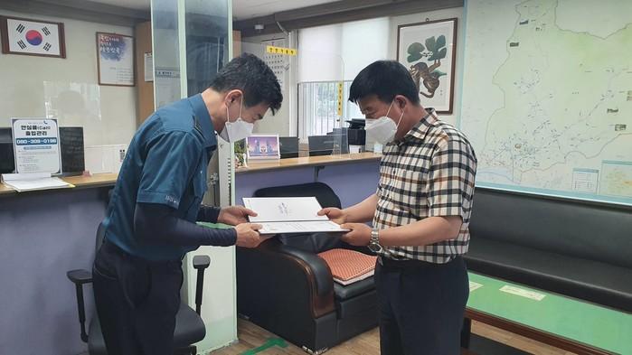 경기 양평군 옥천면사무소는 최근 복지사각지대 발굴 활성화 및 인적안전망 강화를 위해 기존 제2기 명예사회복지공무원 83명 이외에 옥천파출소 경찰관 3명을 명예사회복지공무원으로 위촉했다. 사진은 옥천파출소 경찰관에게 명예사회복지공무원 위촉장을 전달하는 모습. (사진제공=양평군청)