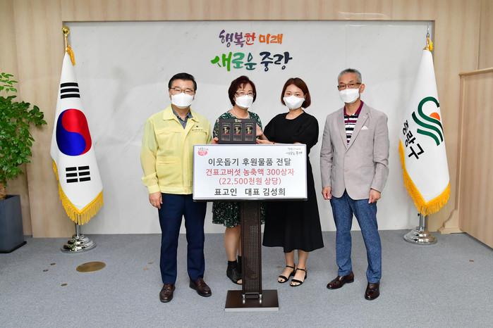 서울 중랑구는 19일 주식회사 표고인으로부터 건표고버섯 농축액 300상자(2250만원 상당)를 전달받았다. 전달 물품은 지역내 복지사각지대 및 저소득 노인 등에 전달될 예정이다. 사진은 전달식에서 류경기 구청장(왼쪽)과 관계자들이 기념촬영을 하는 모습. (사진제공=중랑구청)