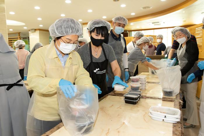 은평구는 21일 (사)나눔문화예술협회와 구내식당에서 ‘well-made 도시락’ 나눔 행사를 했다. 이날 행사는 취약계층에 직접 만든 사랑의 도시락을 나누고 나눔 문화를 확산하기 위해 마련됐으며, 최현석·여경래 셰프 등이 재능 기부에 나섰다. 사진은 김미경 구청장(왼쪽)이 도시락 포장을 하고 있는 모습. (사진제공=은평구청)