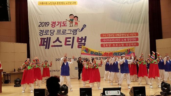 경기 이천시 모가면 신갈리 경로당이 최근 경기도과학진흥재단 경기홀에서 개최된 ‘2019년 경기도 경로당프로그램 경진대회’에서 동상을 차지했다. 신갈리 경로당은 ‘우리의 청춘’이라는 주제로 신나는 건강체조를 선보였다. 사진은 공연을 하는 모습. (사진제공=이천시청)