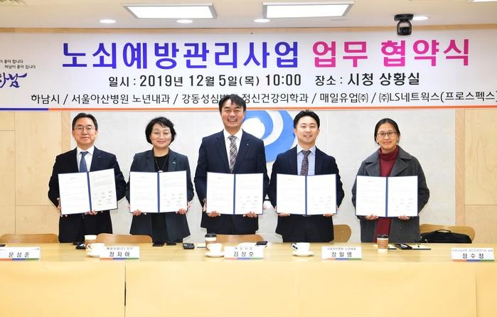 경기 하남시는 5일 서울아산병원 노년내과, 강동성심병원 정신건강의학과, 매일유업, LS네트웍스(프로스펙스)와 함께 노쇠예방관리사업 추진을 위한 협약을 체결했다. 사진은 김상호 시장(가운데)과 병원 및 기업 관계자들이 기념촬영을 하는 모습. (사진제공=하남시청)