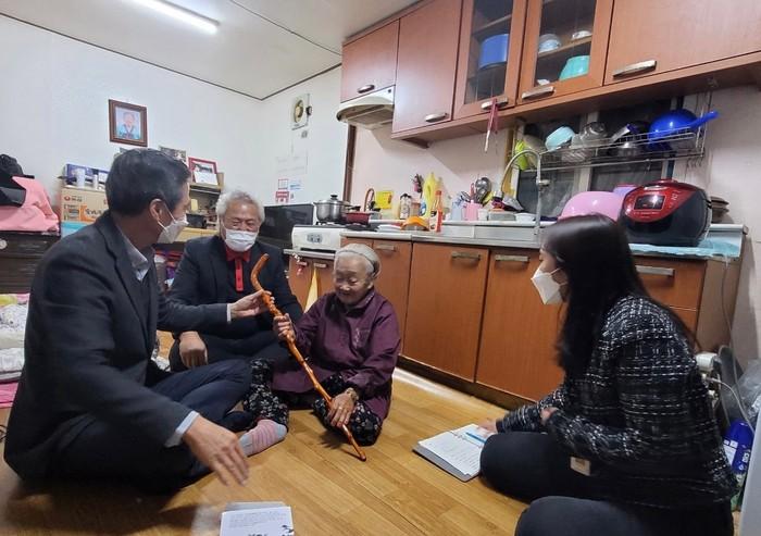 경기 양평군 개군면은 1일 올해 100세를 맞은 개군면 향리에 거주하는 노인가구를 방문해 건강과 장수를 상징하는 청려장(장수지팡이)과 대통령 축하 서한 및 축하 선물꾸러미를 전달했다. 사진은 100세를 맞이한 노인에게 청려장을 전달하고 있는 모습. (사진제공=양평군청)