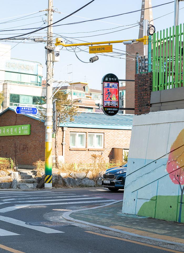 유동인구와 사고 건수, 학교 인접 여부 등을 종합적으로 분석해 선정된 2지역은 각각 방화초 화단과 화곡초 건물 외벽으로 인해 시야가 가려져 우회전하는 차량이 보행자를 인지하기 특히 어려운 곳이다.