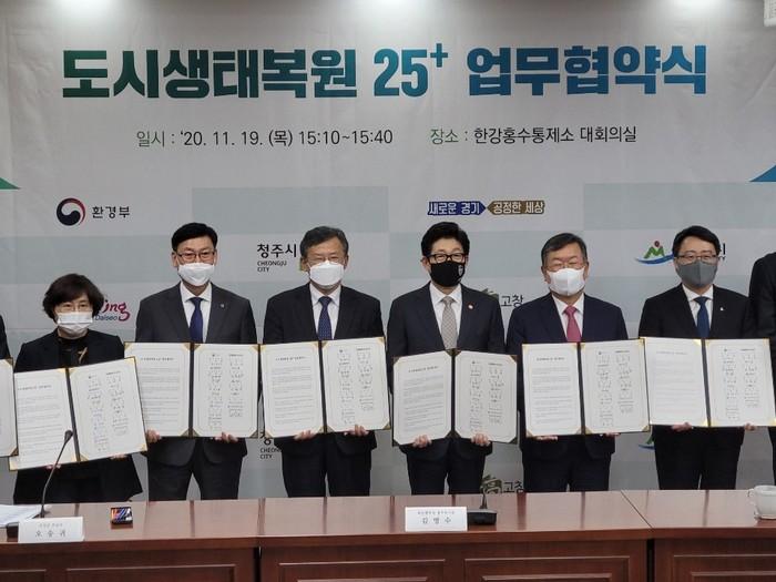 전남 곡성군이 19일 한강홍수통제소 대회의실에서 환경부, 7개 지자체, 한국환경복원기술학회, 한국생태복원협회와 '도시생태 복원 25+ 업무협약'을 체결했다. 이날 협약에 따라 오는 2022년까지 80억 규모의 동악산 생태축(서식지) 복원사업 추진에 협력한다. 사진은 협약 체결 후 관계자들이 기념촬영을 하는 모습. (사진제공=곡성군청)