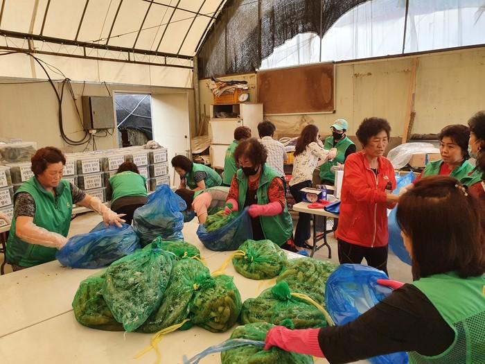 경기 양주시 새마을부녀회는 30일 코로나19로 어려움을 겪고 있는 지역내 취약계층을 위한 ‘사랑의 오이지 평화나눔 행사’를 개최했다. 이날 나눔 행사에서는 담근 오이지 3만개를 소외 취약가정 150가구에 찾아가 전달했다. 사진은 봉사자들이 오이지를 만들고 있는 모습. (사진제공=양주시청)