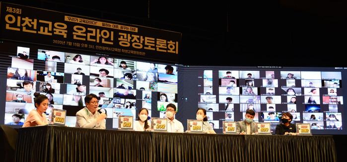 인천시교육청은 최근 '제3회 인천교육 광장토론회'를 개최했다. 이날 토론회에는 사전 접수한 학생·학부모·교직원 등 414명이 온라인 화상 회의 프로그램을 통해 교육정책을 제안했으며, 현장에서는 패널들이 정책에 대해 토론을 했다. 사진은 도성훈 교육감(왼쪽 두 번째)이 온라인 광장토론회를 진행하고 있는 모습. (사진제공=인천시교육청)