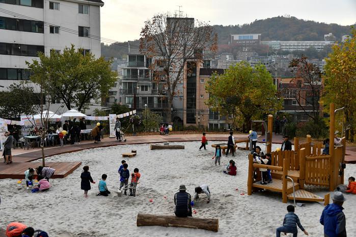 서울 서대문구가 홍제1동 일대에 '신기한놀이터 떼굴떼굴'을 조성하고 12일 문을 열었다. 이 놀이터에는 깊이 50cm 이상의 모래밭과 모래 채취 놀이대, 놀이터용 모래 굴삭기 등이 설치됐다. 사진은 이날 놀이터에서 놀고 있는 아이들의 모습. (사진제공=서대문구청)