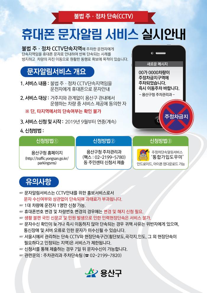 [시민일보 = 홍덕표 기자] 서울 용산구(구청장 성장현)는 이달부터 '불법주정차 단속 문자알림서비스'를 연중 시행한다고 밝혔다.