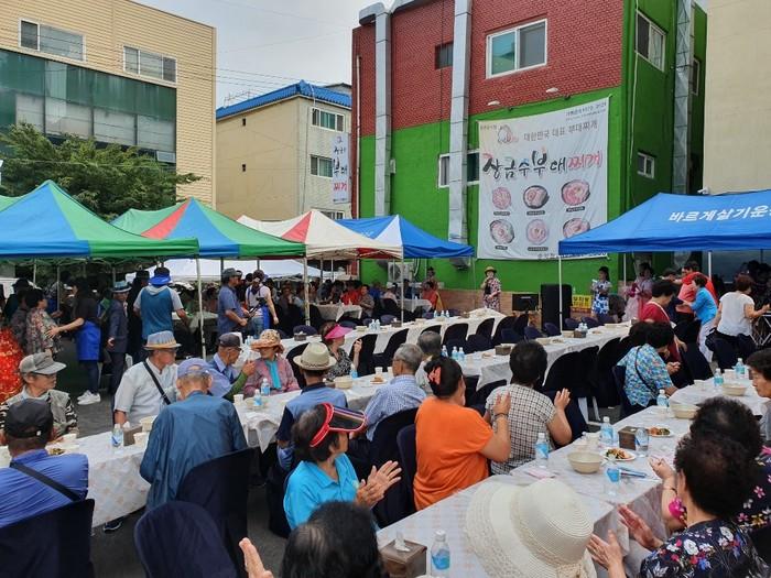 인천 미추홀구 용현3동 바르게살기위원회 회원들은 19일 지역내 새마을금고 주차장에 마련된 행사장에서 지역내 저소득층 노인 200여명에게 직접 준비한 삼계탕과 떡, 과일 등을 대접했다. 사진은 행사장에 방문한 노인들 모습. (사진제공=미추홀구청)