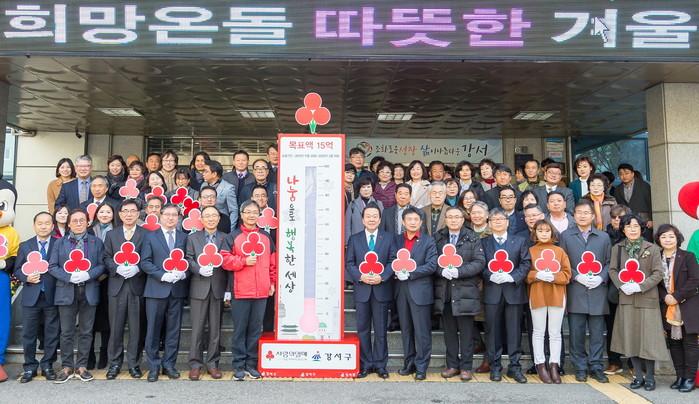 강서구는 27일 구청 정문 앞에서 사회복지공동모금회, 지역사회보장협의체 등 150여명이 참석한 가운데 ‘2020년 희망온돌 따뜻한 겨울나기’ 사랑의 온도탑 제막식을 개최했다. 사진은 노현송 구청장과 참여자들이 기념촬영을 하는 모습. (사진제공=강서구청)