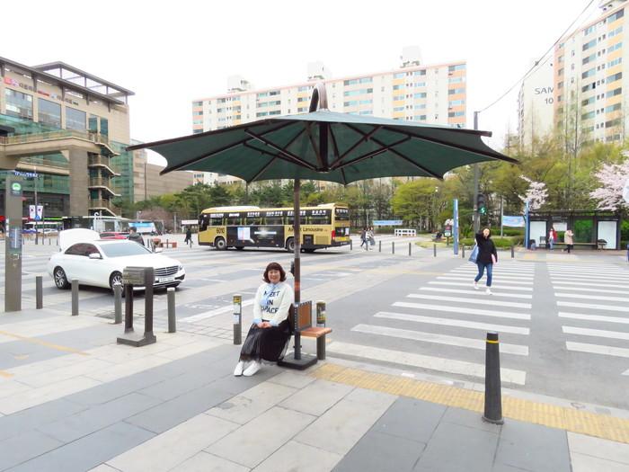 ▲ 개그우먼 김민경씨가 왕십리광장 횡단보도에 설치된 그늘막 의자에 앉아 있는 모습. (사진제공=성동구청) |