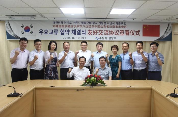 경기 수원시 팔달구는 19일 구청 상황실에서 이훈성 구청장과 한영군 시중구 당서기를 비롯한 시중구 대표단 6명이 참석한 가운데 중국 지난시 시중구와 ‘우호교류 협약서’를 정식 체결했다. 사진은 이 구청장 및 참석자들이 기념촬영을 하는 모습. (사진제공=팔달구청)