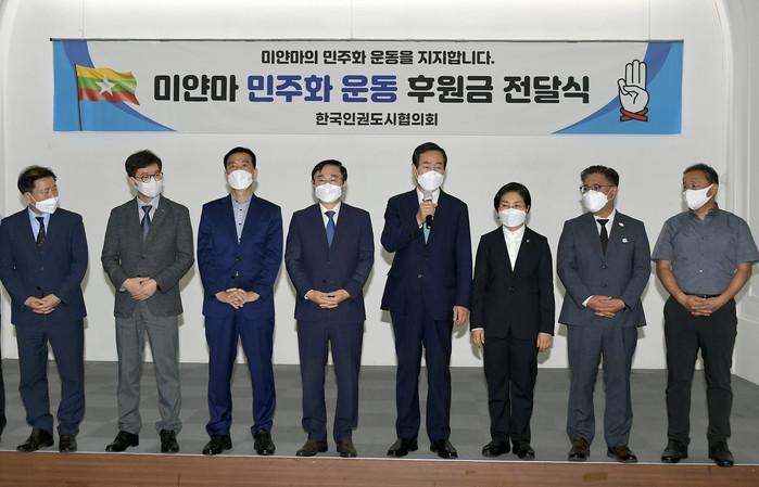 한국인권도시협의회 회원 도시인 서대문구의 문석진 구청장이 8일 ‘미얀마 민주화 운동 후원금 전달식’에 참석해 미얀마 군부의 인권탄압을 규탄하고 민주화 운동을 지지했다. 사진은 전달식에서 문 구청장(오른쪽에서 네 번째)이 미얀마 민주화 운동 지지 발언을 하고 있는 모습. (사진제공=서대문구청)