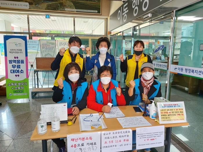 경기 안산시 상록구 이동 주민들이 자원봉사단을 구성해 동 행정복지센터의 재난기본소득 신청 처리 업무를 돕고 있다. 자원봉사단은 주민들을 대상으로 접수 분산을 위한 5부제 신청 안내 등을 하고 있다. 사진은 기념촬영을 하는 모습. (사진제공=안산시청)