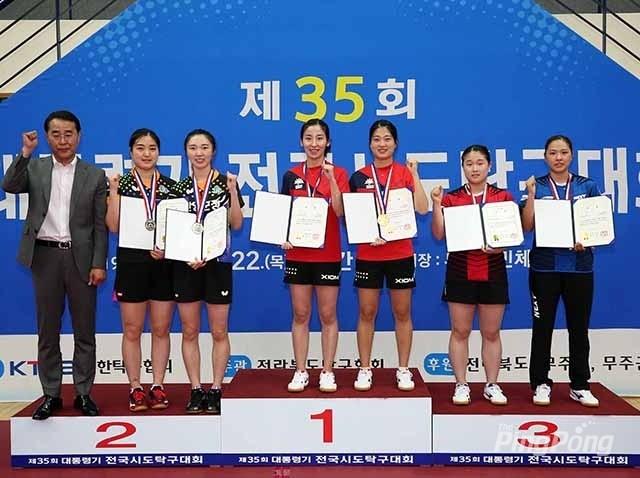 최근 전남 무주 군민체육센터에서 열린 ‘제35회 대통령기 전국시도탁구대회’에서 올해 창단 3년차를 맞은 서울 금천구청 여자탁구단이 개인복식부문 ‘우승’을 차지했다. 사진은 금천구청 여자탁구단 송마음, 정유미 선수(가운데)가 여자개인복식에서 우승한 후 승리의 포즈를 취하고 있는 모습. (사진제공=금천구청)