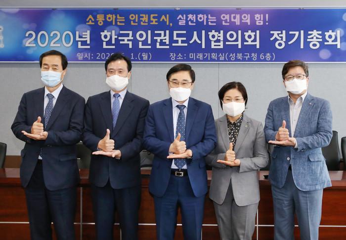 이동진 도봉구청장이 지난 1일 성북구청 미래기획실에서 열린 '한국인권도시협의회 정기 총회'에서 한국인권도시협의회 제2대 회장으로 선출됐다. ‘한국인권도시협의회’는 인권보호증진을 위한 정책교류 및 상호협력을 바탕으로 한 전국 기초지방자치단체간의 인권협의기구이다. 사진은 이 구청장(가운데)이 한국인권도시협의회 회원들과 기념촬영을 하는 모습. (사진제공=도봉구청)