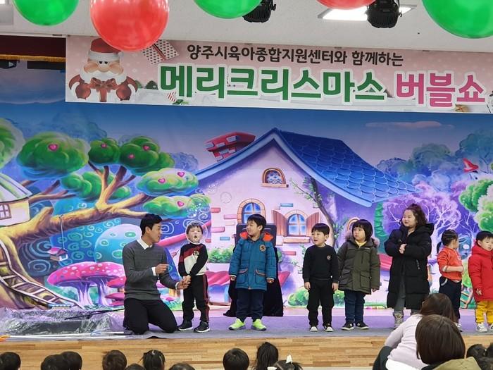 경기 양주시 육아종합지원센터는 최근 지역내 어린이집 45곳 영유아 1100여명을 초청한 가운데 ‘메리크리스마스 버블쇼’ 공연을 했다. 이날 아이들은 직접 공연에 참여하며 즐거운 시간을 보냈다. 사진은 무대에 오른 아이들 모습. (사진제공=양주시청)