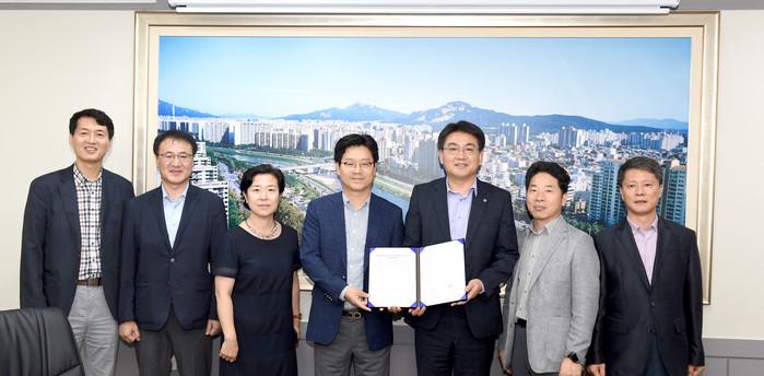 서울 노원구는 27일 구청장실에서 SK텔레콤과 함께 ‘공동육아나눔터 이전설치 관련 업무 협약’을 체결하며 무상 사용 공간 제공 등에 협력하기로 했다. 사진은 오승록 구청장(오른쪽 세 번째)과 관계자들이 기념촬영을 하는 모습. (사진제공=노원구청)