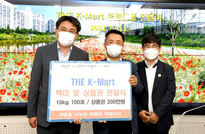 서울 노원구는 12일 상계1동에 새로 문을 연 THE K-Mart로부터 지역내 어려운 이웃을 위한 백미 100포(10kg)와 상품권 200만원을 기부받았다. 구는 물품을 지역내 저소득층에 전달할 예정이다. 사진은 전달식에서 오승록 구청장(왼쪽)이 관계자들과 기념촬영을 하는 모습. (사진제공=노원구청)