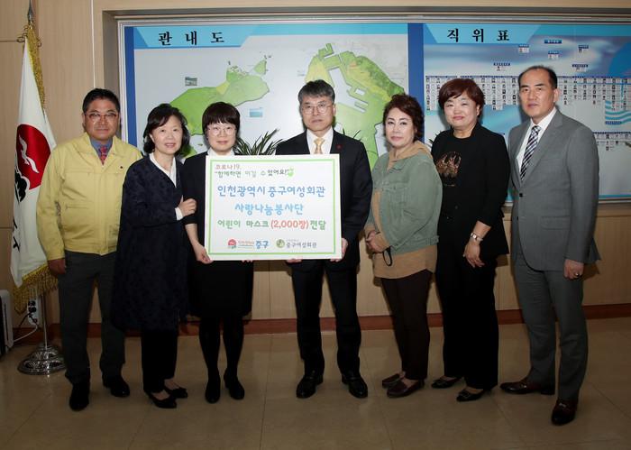 인천 중구가 최근 코로나19 확산으로 마스크 수급에 어려움을 겪고 있는 지역내 어린이집 원아들을 위해 중구여성회관이 제작한 필터 교체형 면마스크 전달식을 개최했다. 사진은 전달식에 참석한 홍인성 구청장(가운데) 및 관계자들이 기념촬영을 하는 모습. (사진제공=중구청)